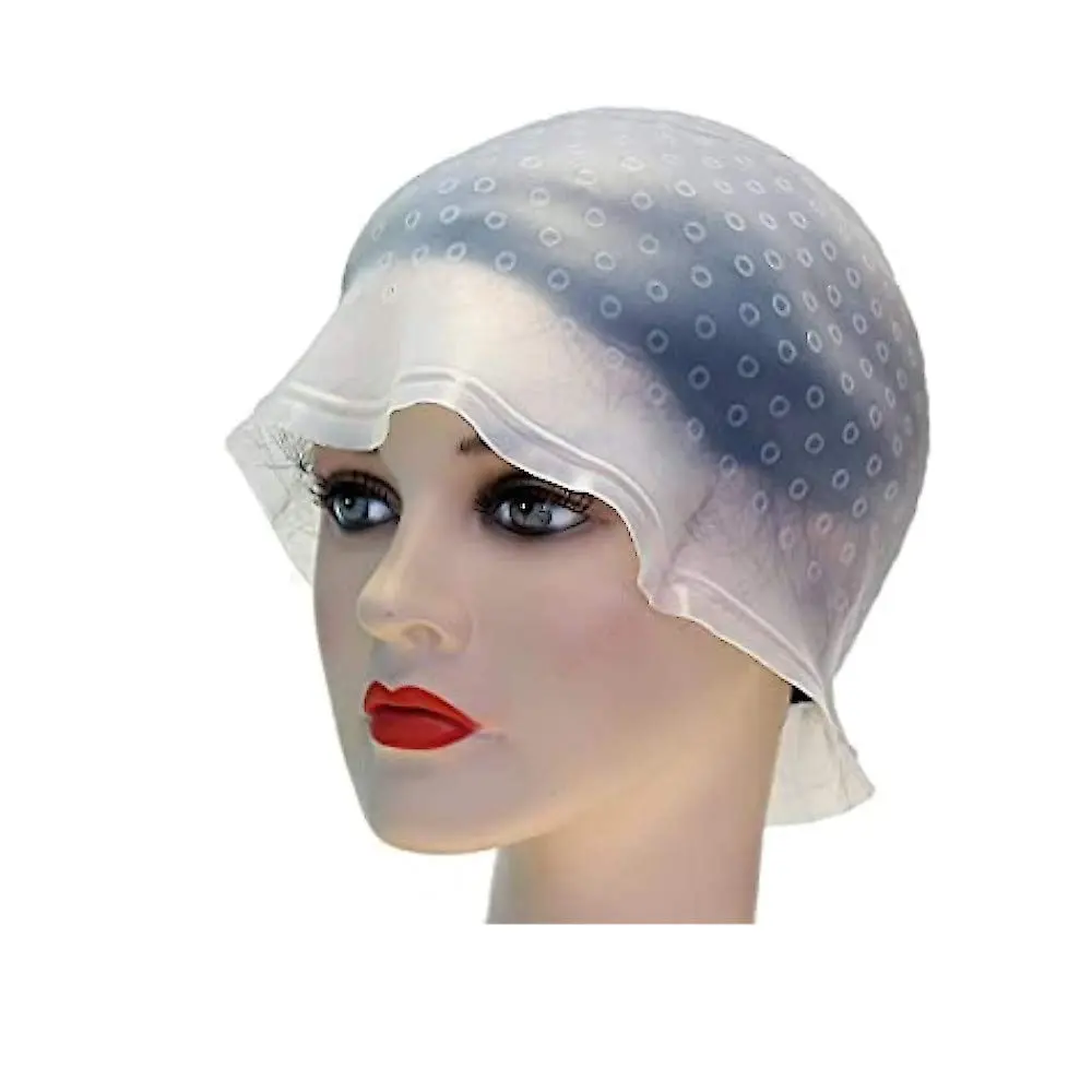 Bonnet en silicone à trous servant à passer les mèches de cheveux pour les teindre, livré avec un crochet en plastique. Avec rebord pour recueillir les écoulements.