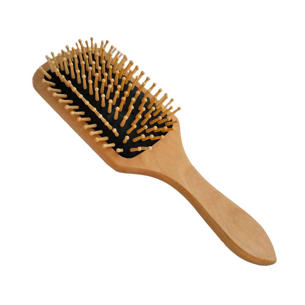 La brosse à picots en bois, masse le cuir chevelu, démêle et coiffe.