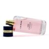 Flacon métallique de “CORAL Eau de Parfum pour Femme” avec ruban rose, à côté d’une boîte à motifs.