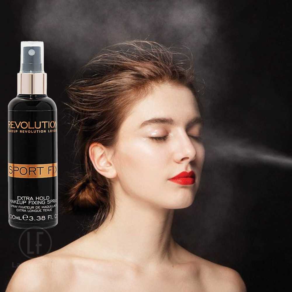 Sport Fix Le spray fixateur de maquillage 100 ml de Revolution Make Up fixe votre maquillage et rend votre teint mat toute la soirée peu importe la température et l’humidité. Superbe fini mat sans brillance.