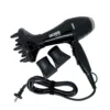 : Sèche-cheveux Megapower Pro 6000 noir avec deux embouts concentrateurs, boutons de contrôle rouge et bleu sur la poignée.