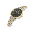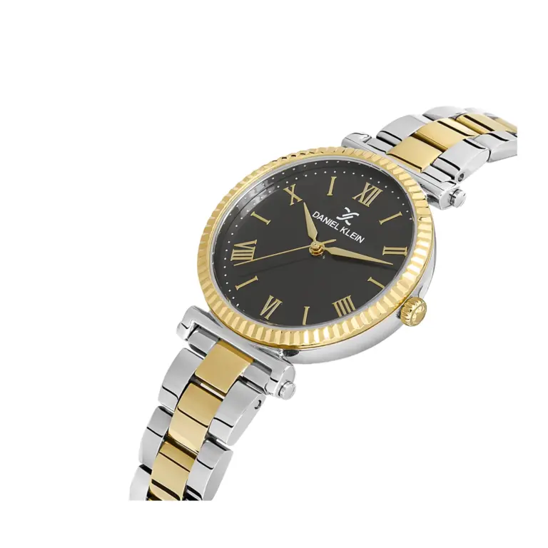 Montre élégante Daniel Klein pour femme avec cadran noir et bracelet métallique bicolore.