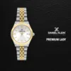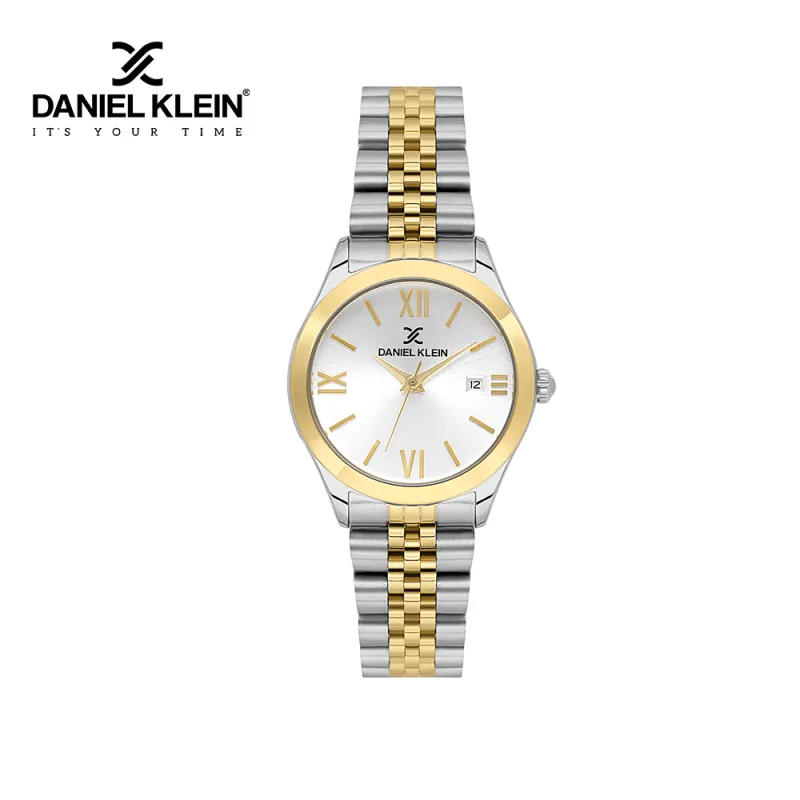 Montre femme Daniel Klein au design bicolore argent et or. Boîtier rond élégant, cadran blanc à chiffres romains et affichage de la date. Bracelet acier inoxydable à maillons alternés pour un style chic et intemporel.