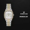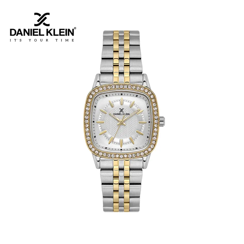 Montre femme Daniel Klein au design carré élégant, cerclée de strass et dotée d’un bracelet bicolore argent/or. Cadran argenté texturé, aiguilles dorées et finition raffinée pour un look chic au quotidien.