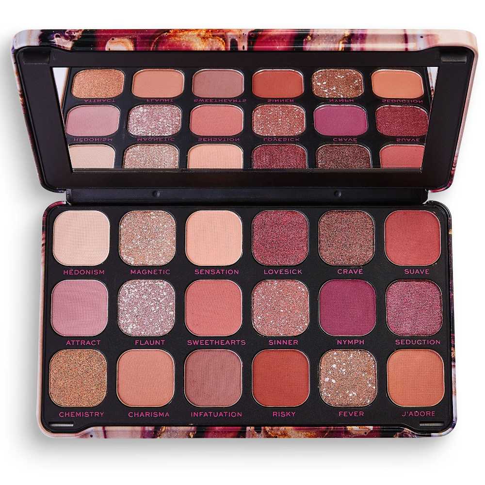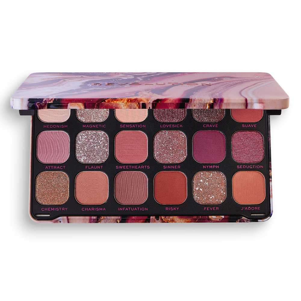 La palette de fards à paupières “Forever Flawless Allure ” de Revolution propose 18 fards à paupières mattes et scintillants dans un luxueux emballage d’aspect marbré.