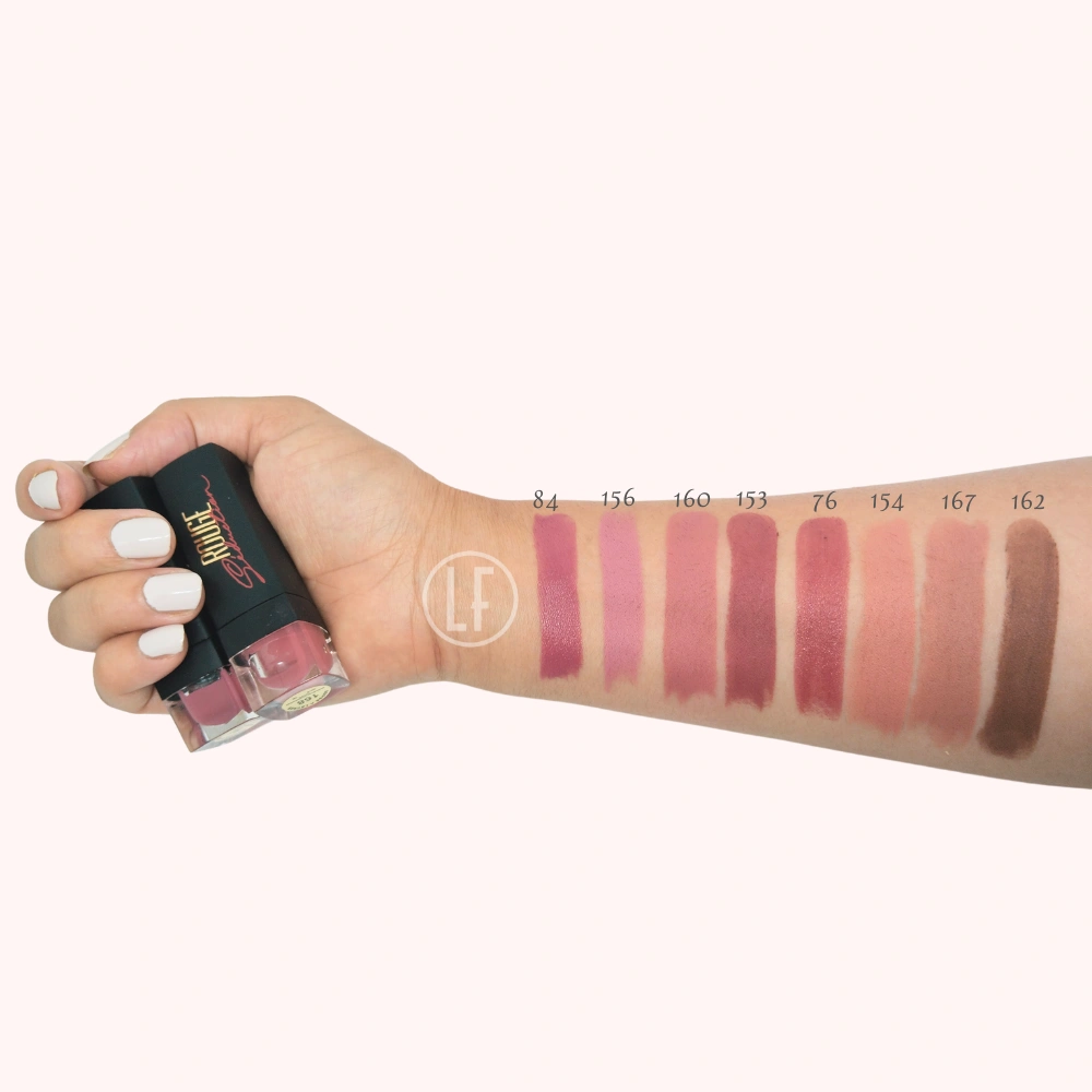 Rouge à lèvres Edition 12 H Bourjois : couleur intense, semi-matte, tenue 12h, hydratation au beurre de karité.