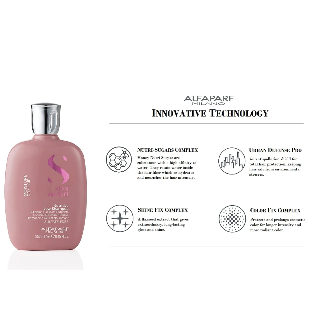 Le shampooing sans sulfates Semi Di Lino Hydratant nettoie en douceur et favorise le processus de reconstruction de la fibre capillaire.